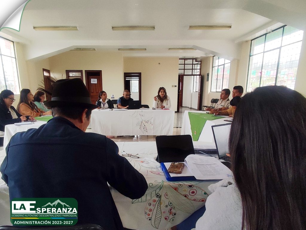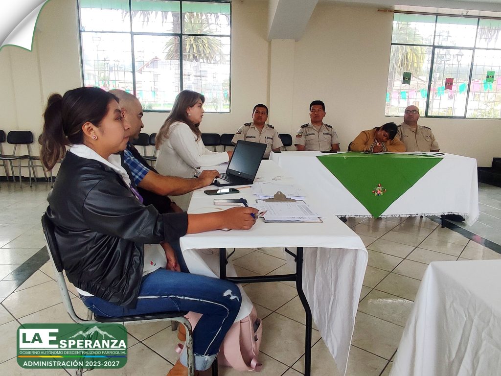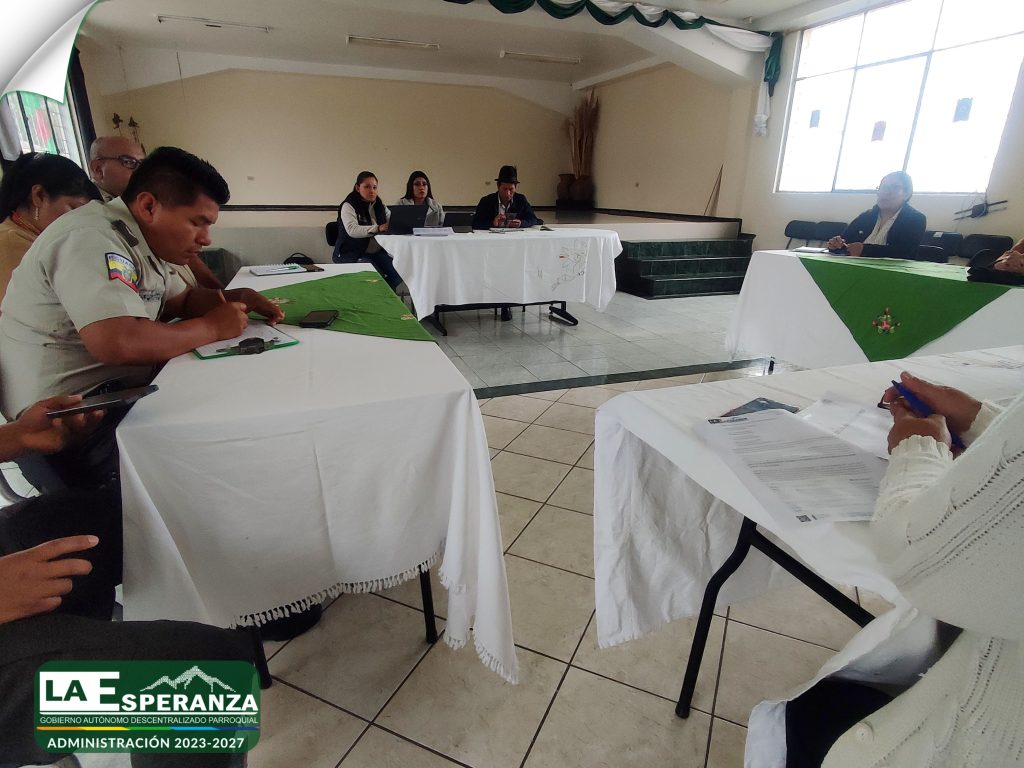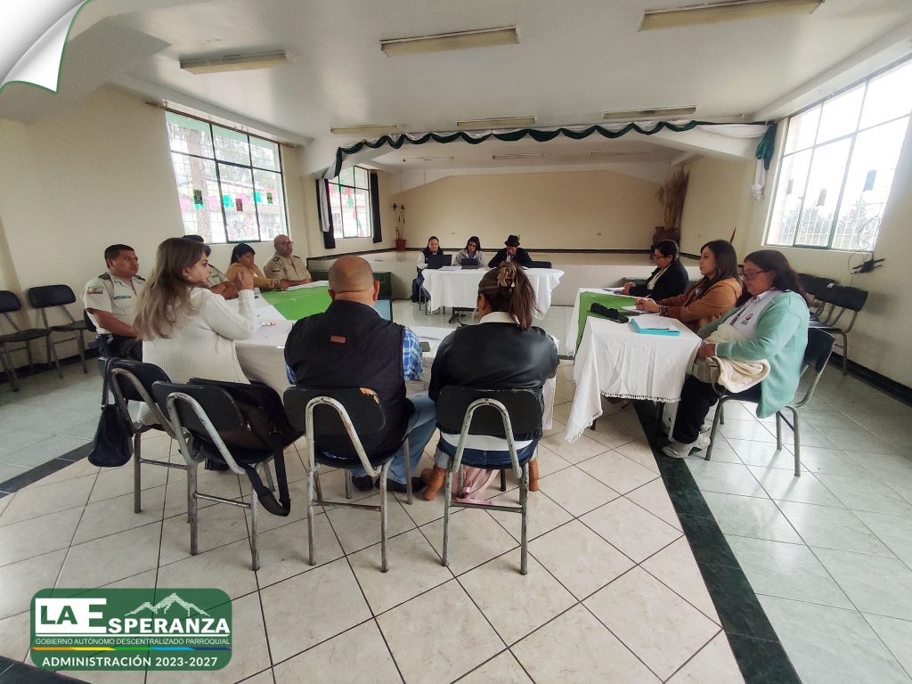 Con la valiosa participación de: Autoridades del GAD Parroquial, Teniente Político, Policía Nacional, Comité local de Salud, Representantes del MSP, Subcentro de Salud La Esperanza, Unidades Educativas y delegados del MDH, se desarrolló la Mesa Intersectorial, un espacio de articulación y diálogo entre instituciones, con el objetivo de coordinar acciones conjuntas en beneficio del desarrollo social y comunitario de la parroquia La Esperanza.