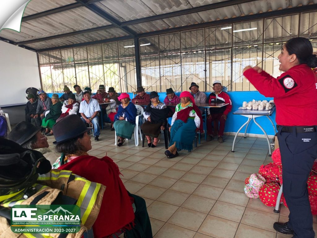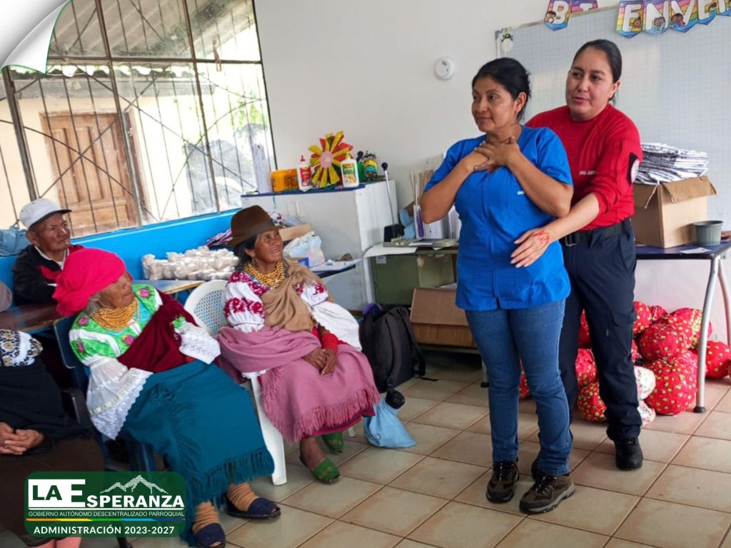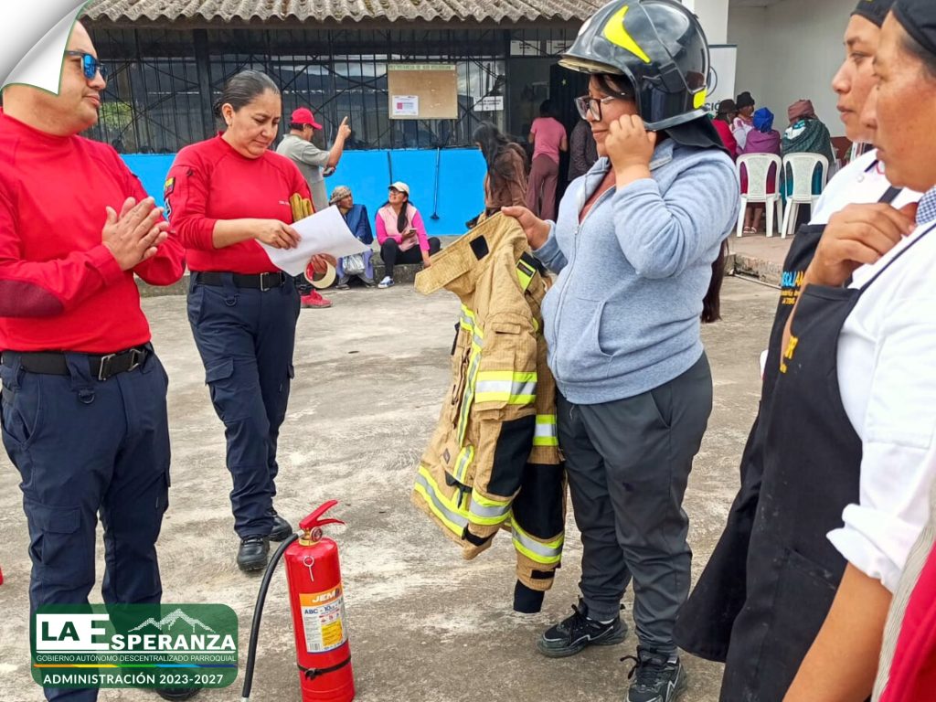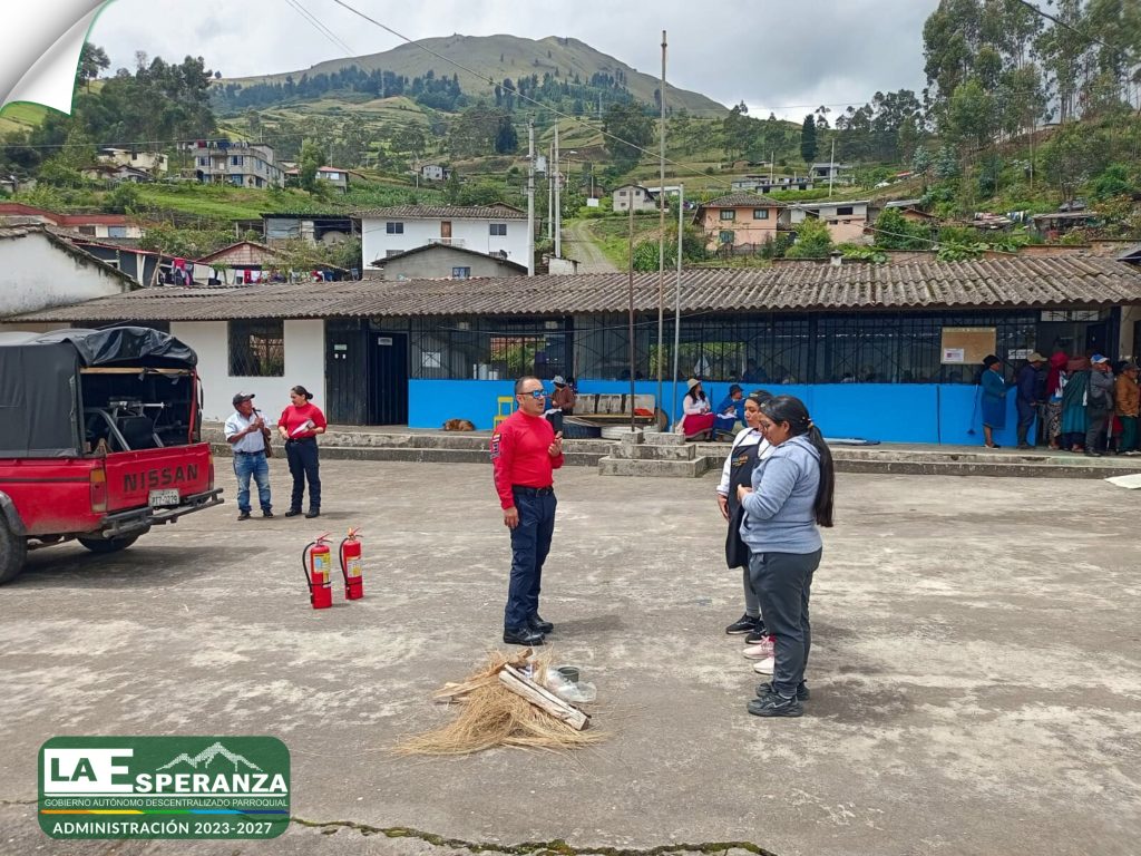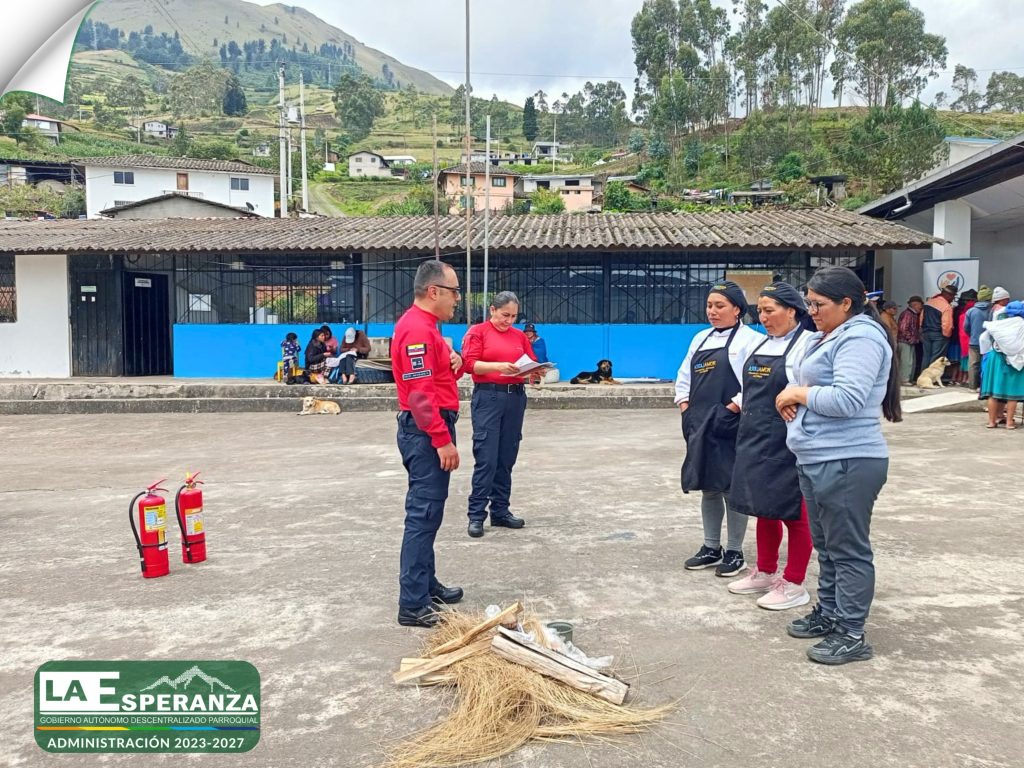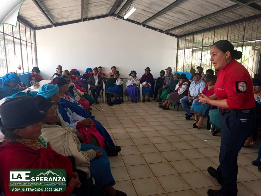 El GAD Parroquial La Esperanza, en coordinación con el Cuerpo de Bomberos de Ibarra, desarrolló una capacitación en gestión de riesgos dirigida a los participantes del proyecto P.E.J.E.A Paniquindra, con la activa participación de los adultos mayores y personal técnico.